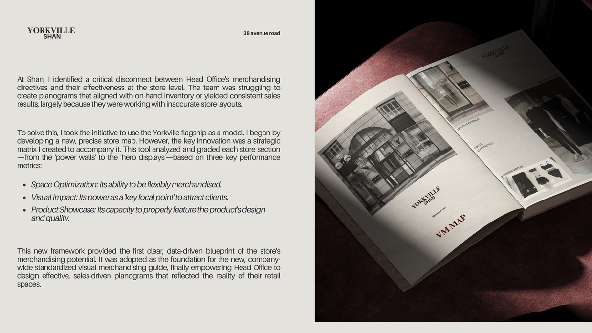 By synthesizing sales analytics with floor plan optimization and proactive staff collaboration, I revitalized the visual merchandising strategy at Shan Toronto. This data-informed approach not only accelerated the sell-through of low-stock inventory but also successfully converted passive foot traffic into active client appointments with stylists. The success of this strategy—merging frontline insights with hard sales targets—led to my promotion to oversee Visual Merchandising for all Shan Ontario locations, and subsequently, the expansion of my role to cover the Quebec storefronts.
